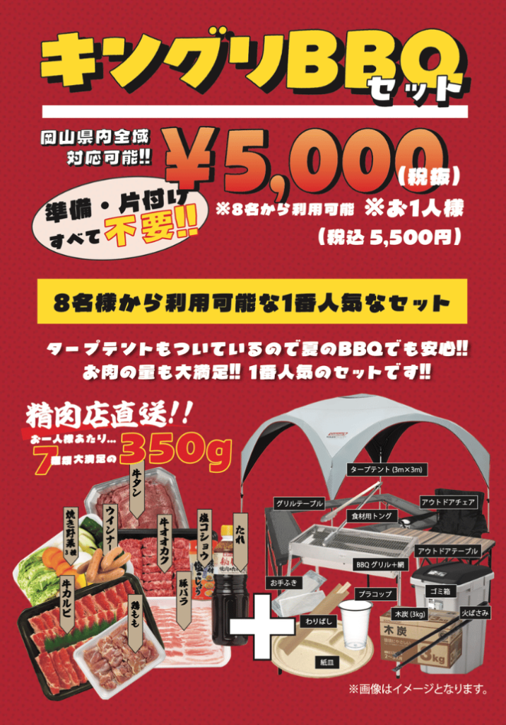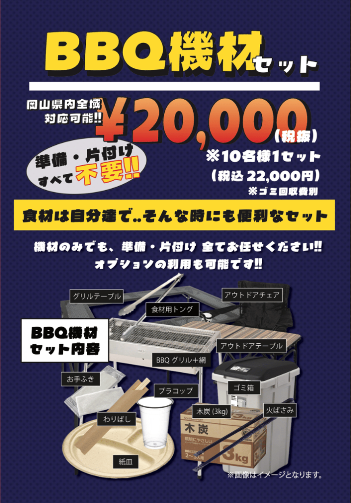 出欠確認をご連絡いただくだけでOK。準備・買い出し・設営・片付けまで全てお任せ。仕事終わりに作業着のままBBQが楽しめます。